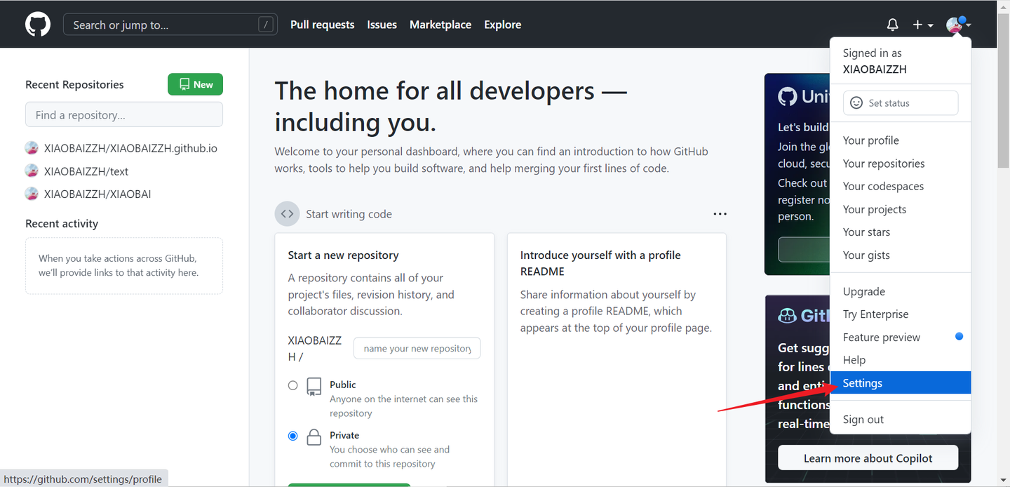 打开 Github,点击右上角 settings