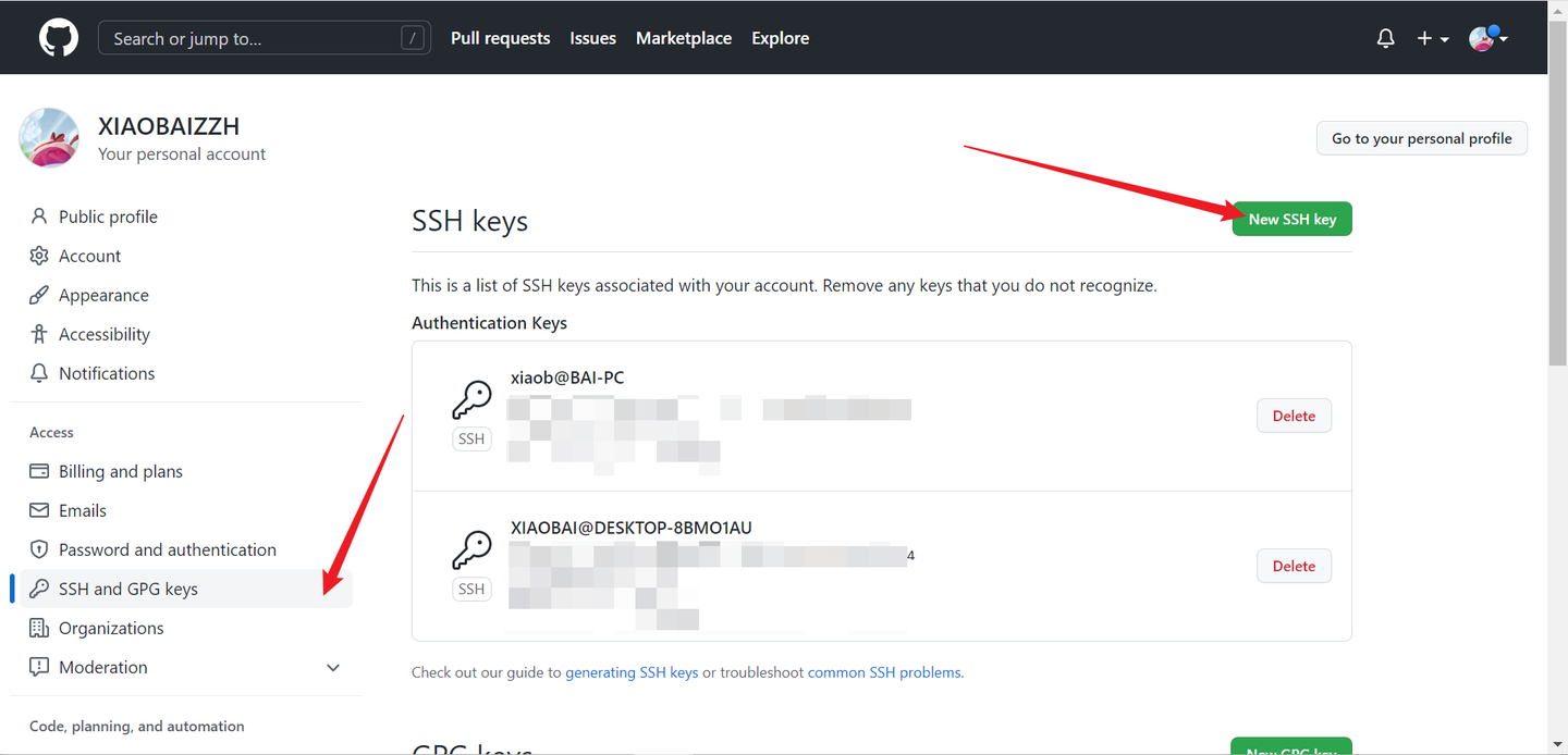 点 SSH and GPG keys,再点击 New SSH key